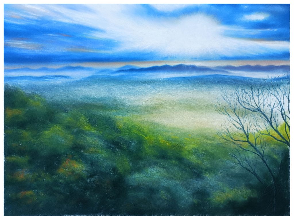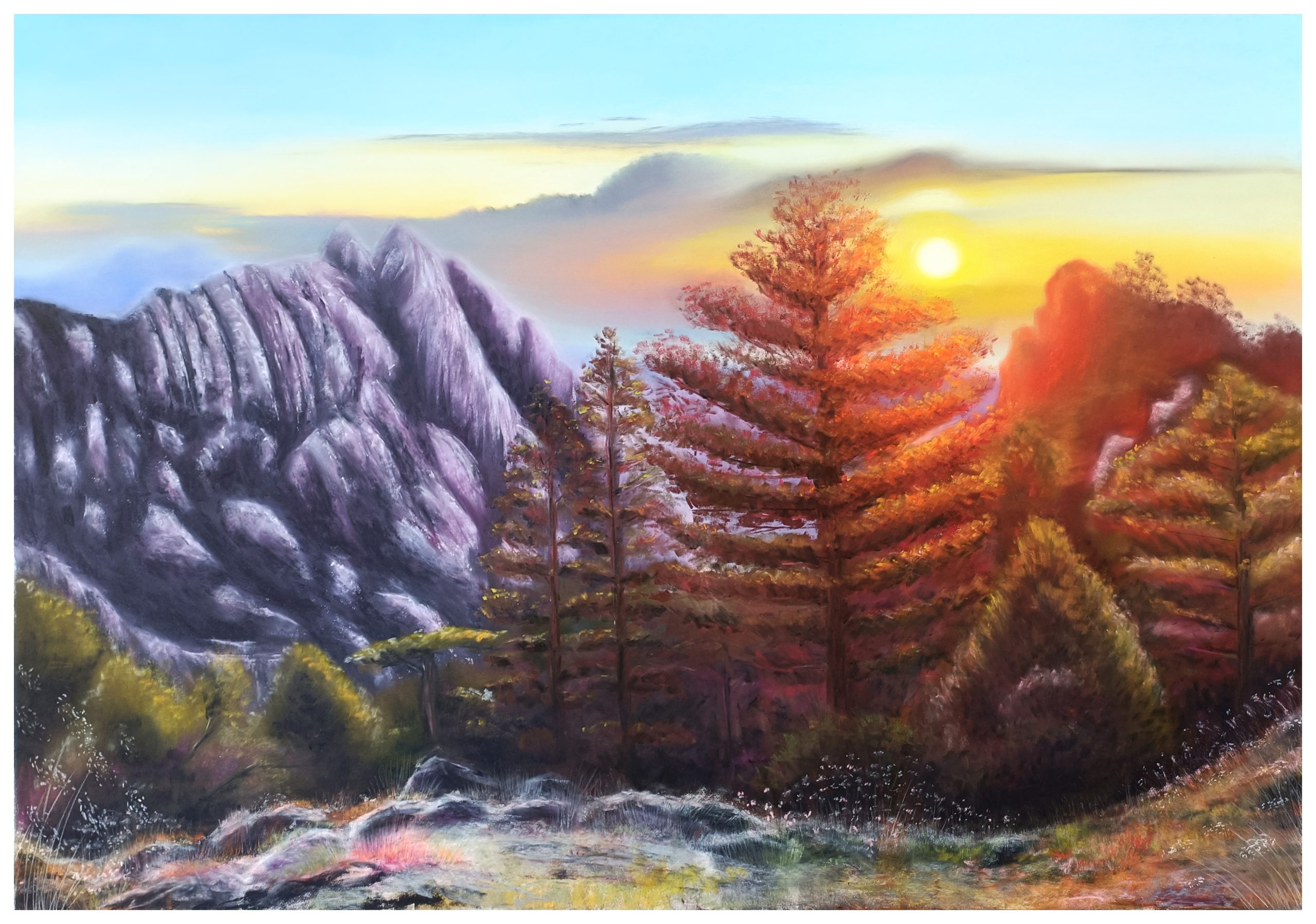 Région de mon enfance, la forêt de Fontainebleau m’a bercée plus jeune par son atmosphère envoûtante. À travers le pastel sec, je tente de retrouver le mystère de ses sous-bois, la lumière filtrée entre les feuillages, et l’émotion profonde qu’elle m’inspire encore aujourd’hui.